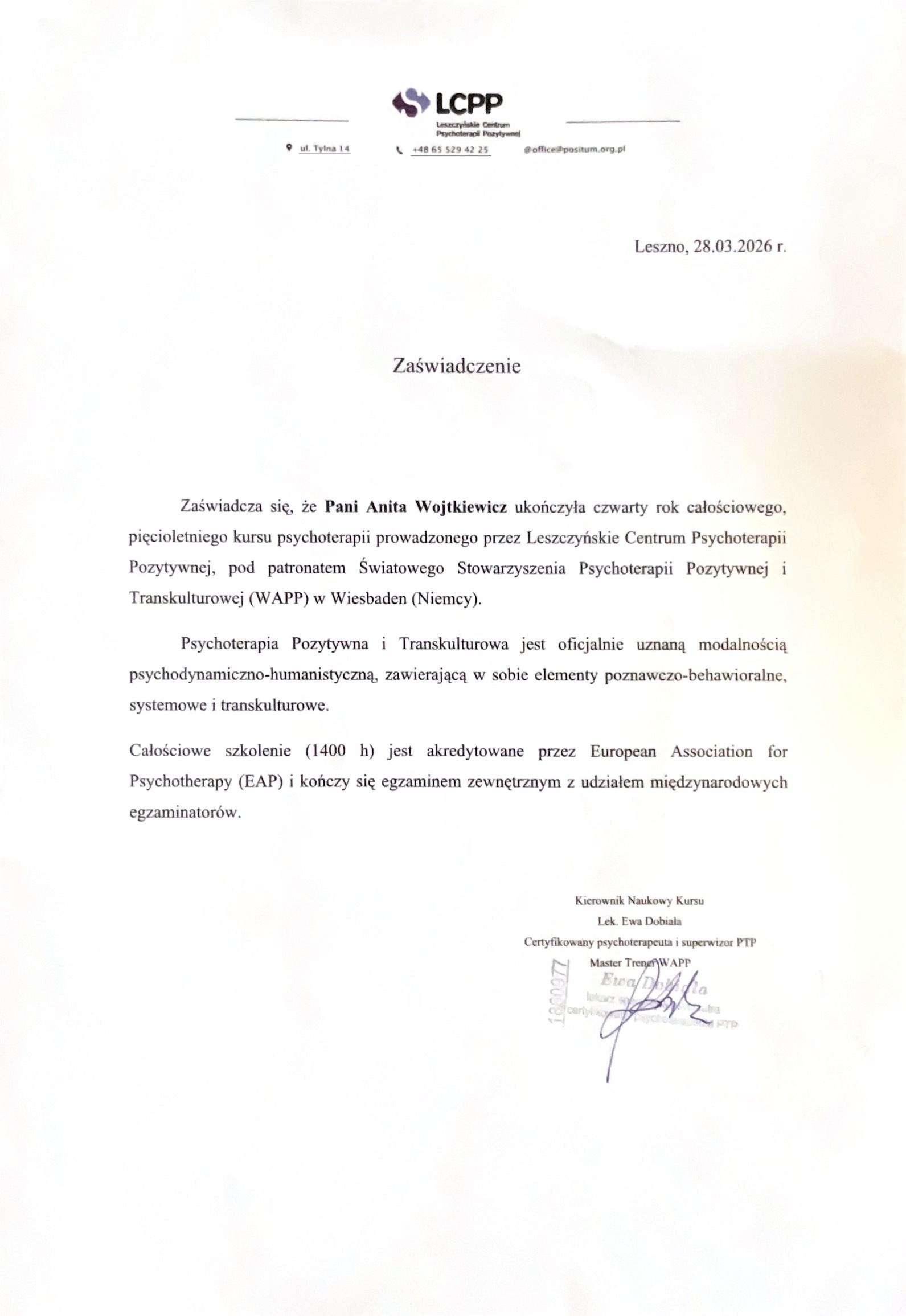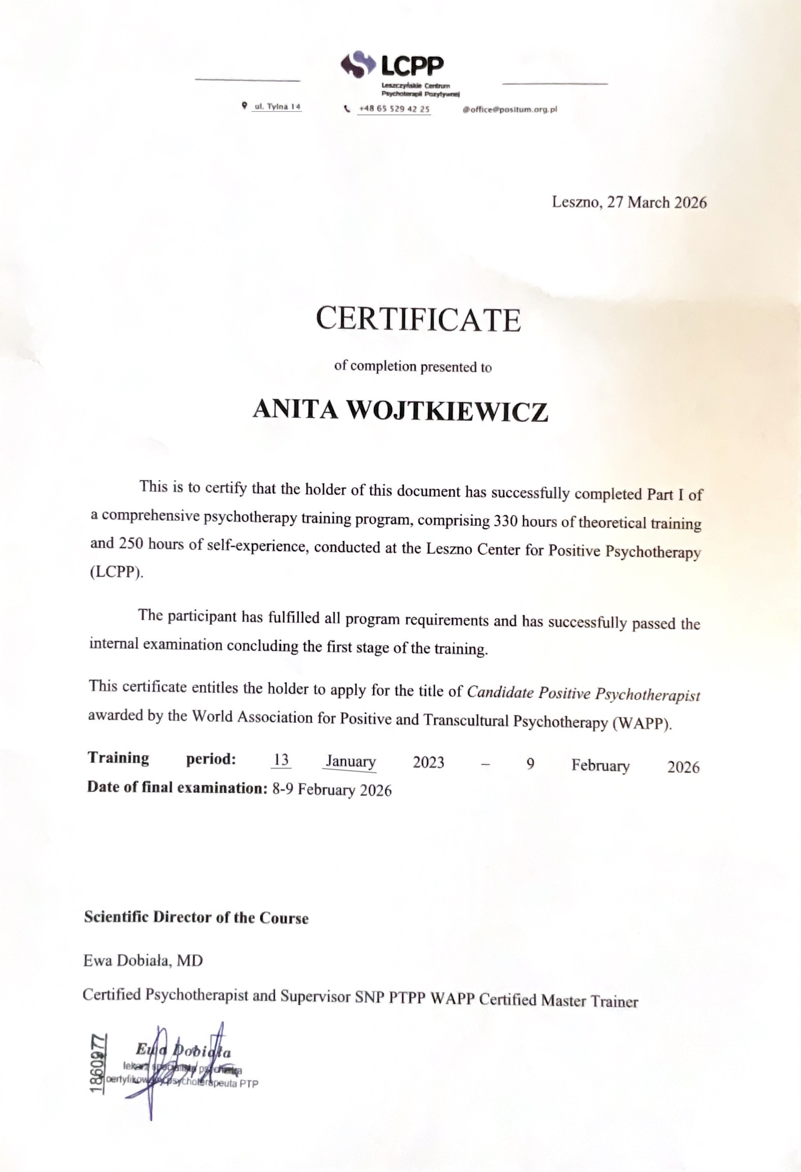 Jest konsultantką psychoterapii transkulturowej pozytywnej i psychoterapeutką w trakcie szkolenia, pracującą również z osobami atypowymi po doświadczeniu traumy/z PTSD – m.in. z wykorzystaniem metody EMDR.
