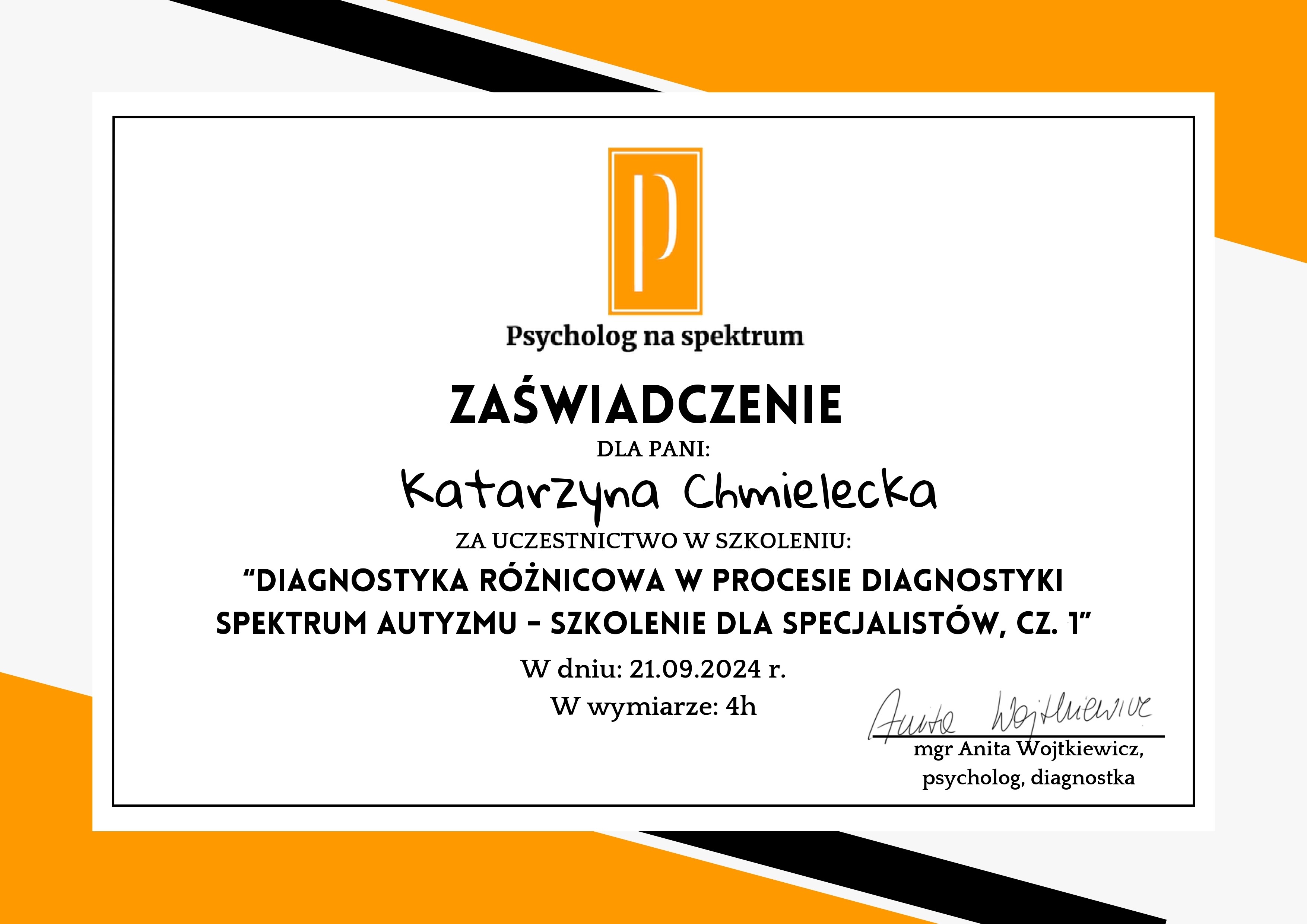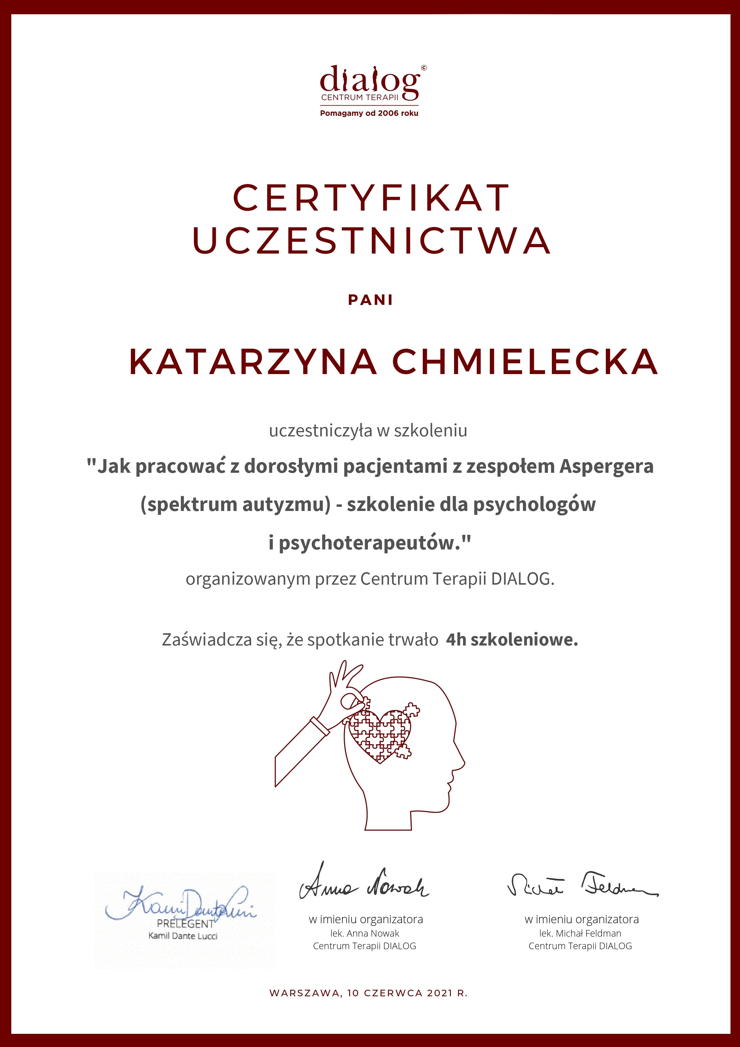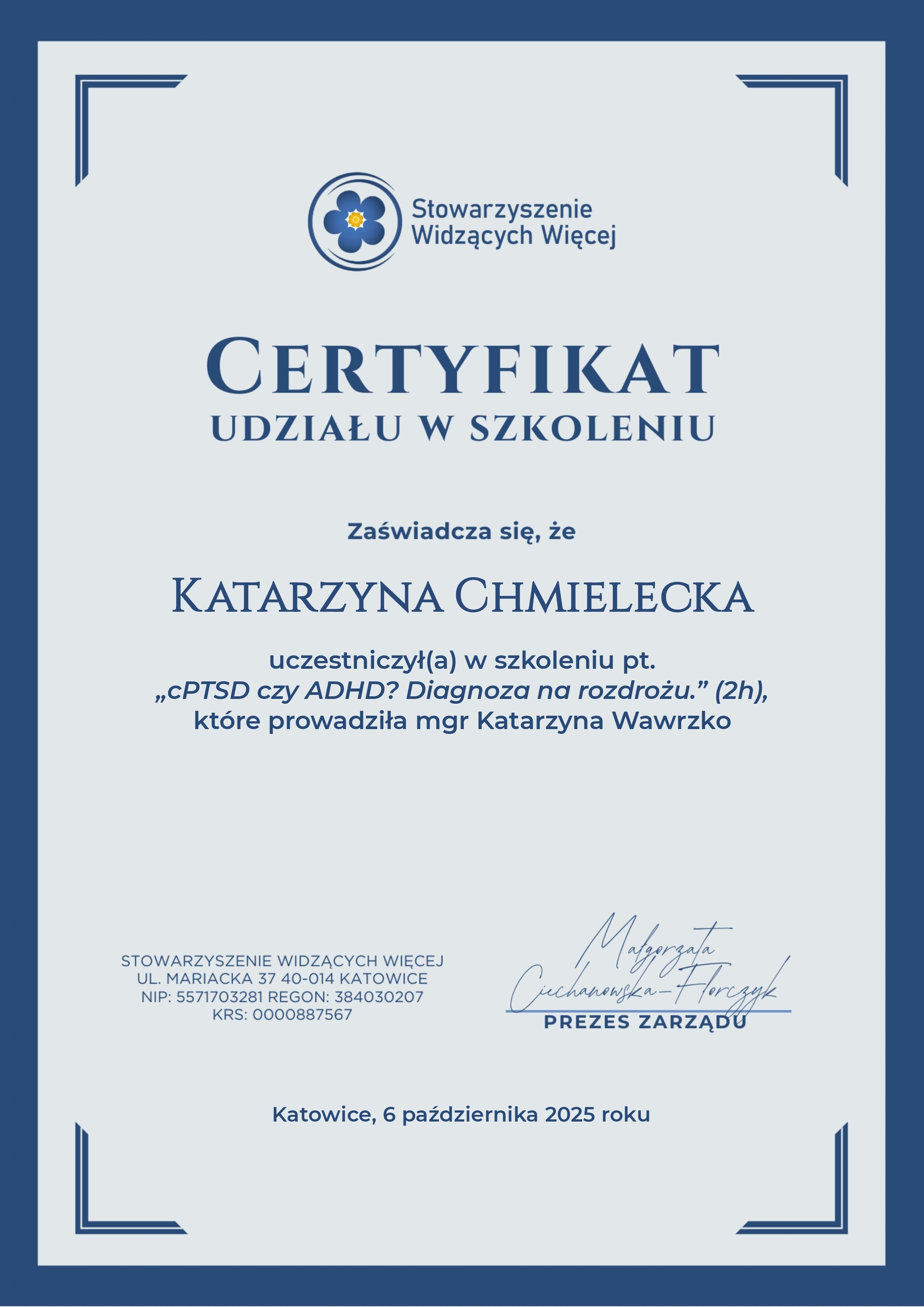 Psycholożka specjalizująca się w diagnozie autyzmu i ADHD u dorosłych oraz wsparciu psychologicznym osób neuroatypowych. Sama ma podwójną diagnozę (AuDHD), którą otrzymała w dorosłości, co pozwala jej lepiej rozumieć doświadczenia osób klienckich i oferować im empatyczną, dostosowaną do ich potrzeb pomoc. Ukończyła studia magisterskie z psychologii ze specjalnością psychoterapia i terapia seksualna, a także liczne kursy specjalistyczne dotyczące pracy z osobami neuroróżnorodnymi, w tym diagnozy wyzwań neurorozwojowych. Doświadczenie zawodowe zdobywała na Oddziale Dziennym Psychiatrycznym Szpitala Wolskiego.